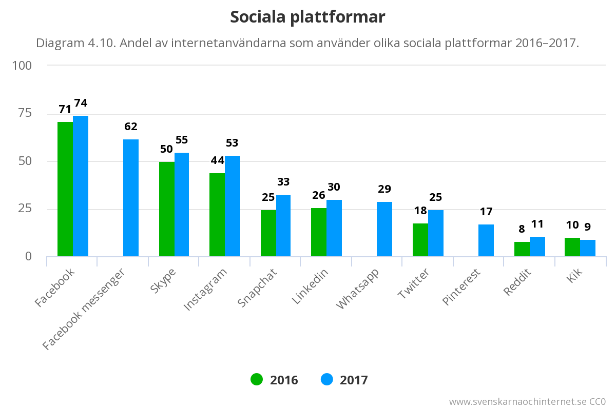 Enligt IIS årliga sammanställning Svenskarna och Internets så hade 74 procent av Sveriges befolkning Facebook 2017.